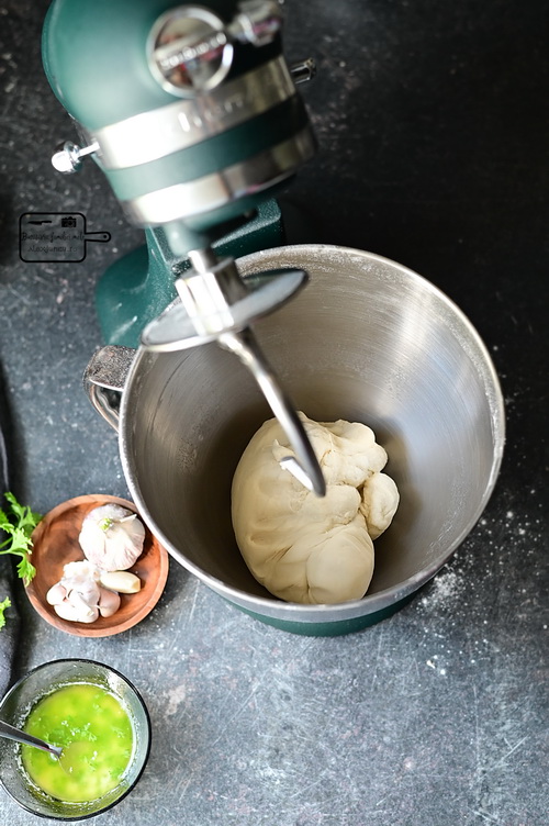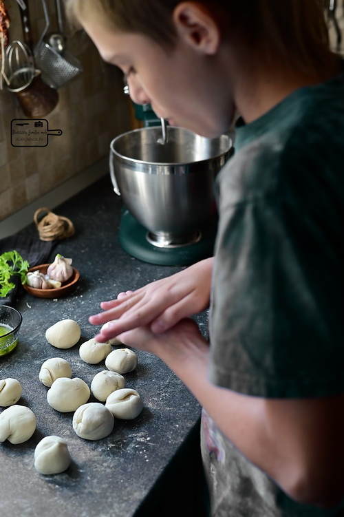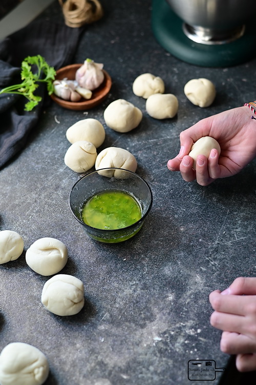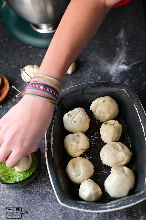 Împart aluatul în jumătate, și fiecare jumătate o împart în bucăți cât mărimea unei mingi de pingpong. Pregătesc o tavă cu puțin unt sau ulei de măsline. Fiecare minge de aluat o trec prin untul aromat și apoi o așez în tavă.