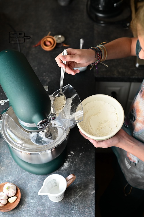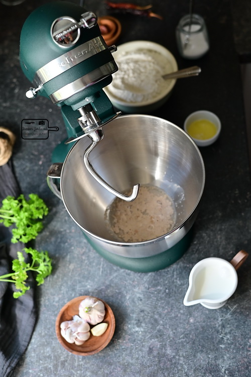 Acum adaug untul, laptele, sarea și încep să adaug făina puțin câte puțin. Las mixerul să frământe vreo 10 minute. Aluatul trebuie să fiu unul care se lipește de fundul vasului dar s-a îndepărtat de pe margini. Altfel spus este un aluat puțin lipicios și moale.