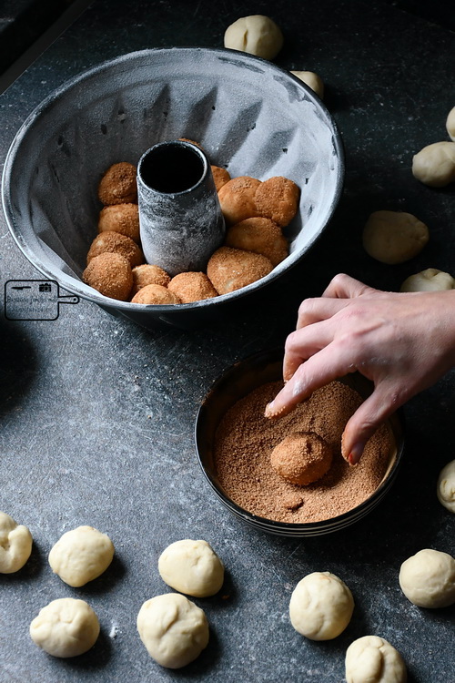 Întru vas amesteci jumătate din cantitatea de zahăr cu scorțișoara. Tăvălești fiecare bila de aluat până se acoperă pe toate părțile, ca în fotografii.