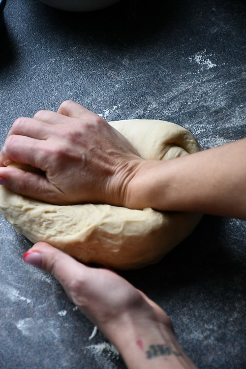 Când aluatul este gata crescut adaugi puțină făină pe masa de lucru și frămânți încă vreo câteva minute. Rulezi aluatul și îl împărți în bucăți. 36. Din bucățile de aluat faci niște bile cu ajutorul palmelor.