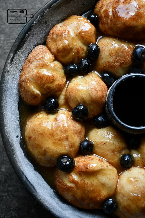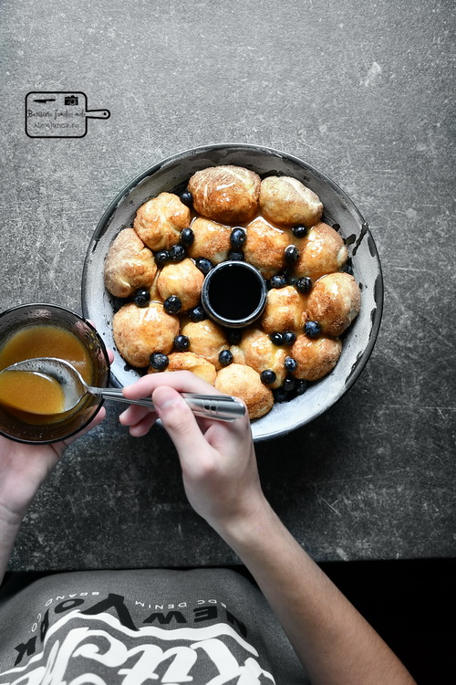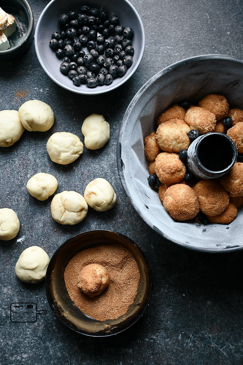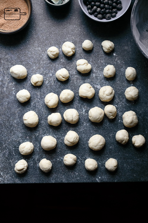 Transferi bilele de aluat tăvălite prin scorțișoară în tava unsă. Între rândurile de bile adaugă afinele. Când toate bile și afinele sunt așezate în tavă, adaugă deasupra restul de scorțișoară cu zahăr rămasă în vas.