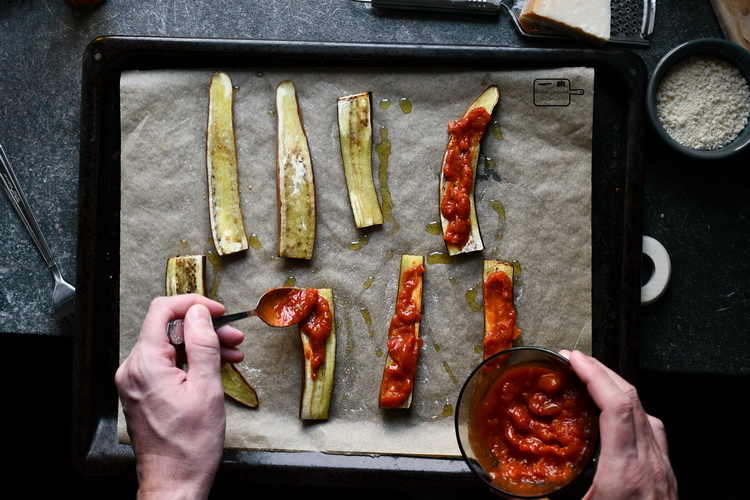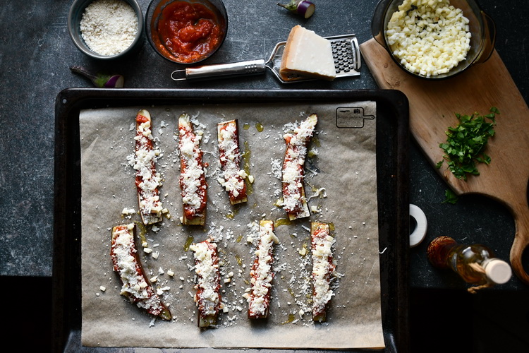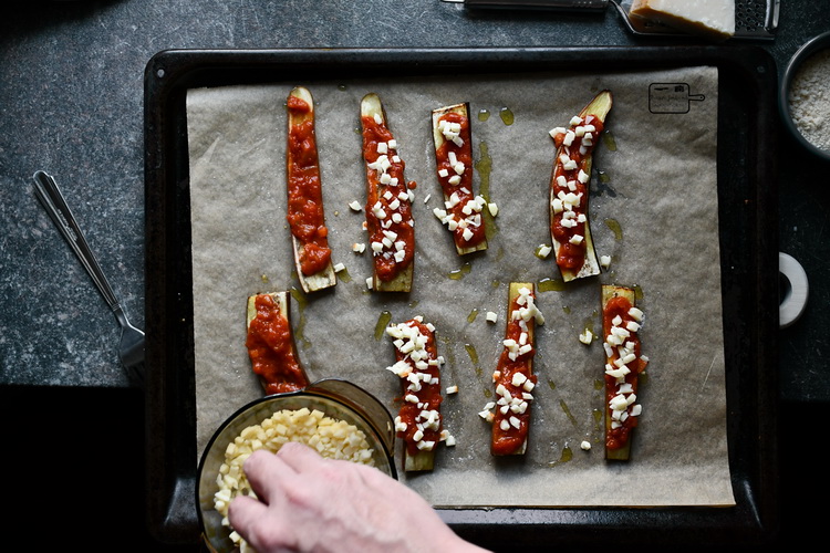 - Step 3 Scoateți vinetele din cuptor. Adăugați marinara peste jumătăți. Presărați mozzarella uniform pe fiecare.