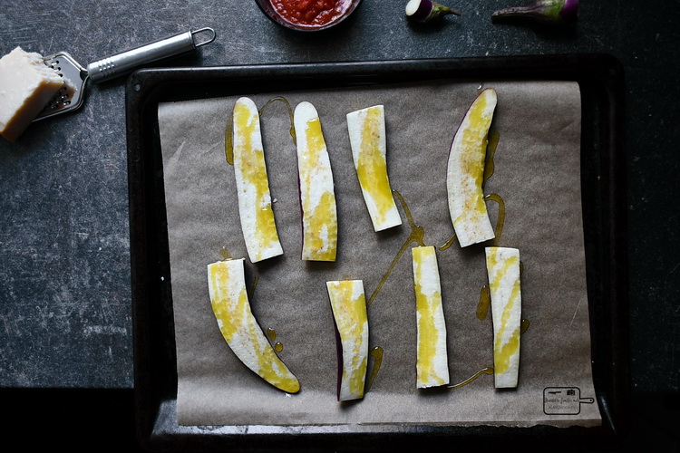 - Step 2 Aranjați vinetele tăiate în jumătate, cu partea tăiată în sus, pe o tavă pregătită cu hârtie de copt. Stropiți-le cu ulei de măsline și asezonați cu sare. Dați-le la cuptor aproximativ 10 minute până se înmoaie.