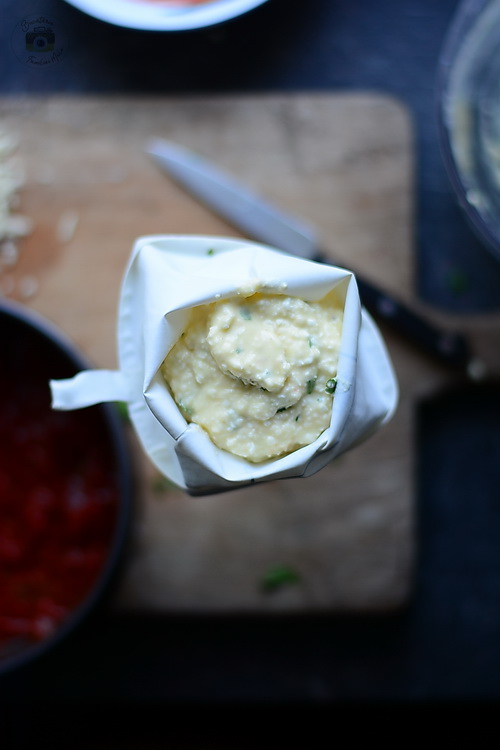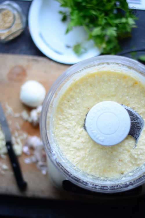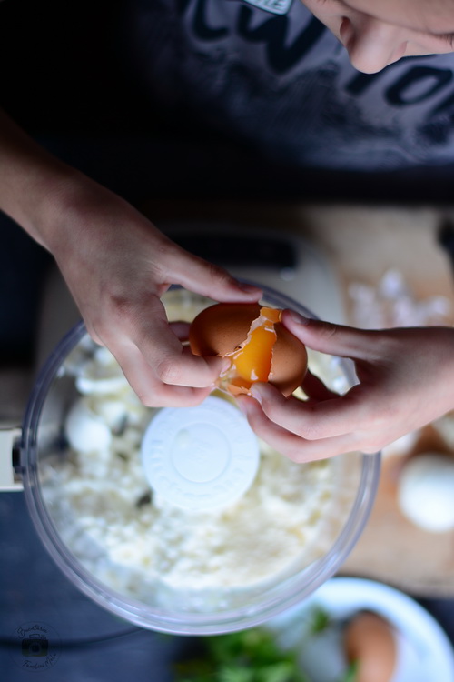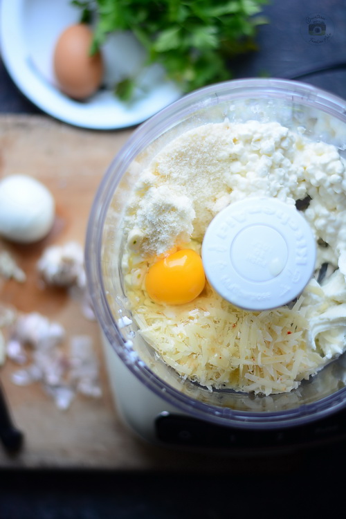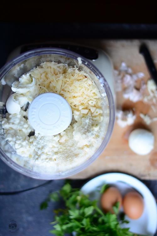 În robotul de bucătărie adăugați: cottage chesse, mozarella di buffalla, brânza maturată, ouăle, usturoiul mărunțit și jumătate din cantitatea de parmezan. Apăsați pulse până obțineți un amestec omogen.