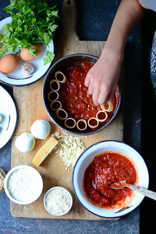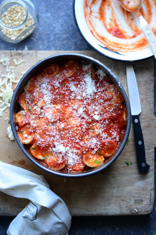 Turnați jumătate din cantitatea de sos de roșii în partea de jos a unui vas care merge la cuptor. Eu am o folosit o formă de tort deoarece copiii au vrut să obțină un tort de paste.