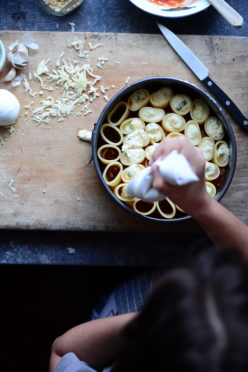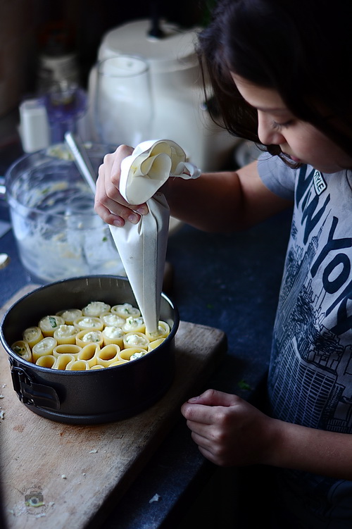 Umpleți fiecare pasta cu o cantitate generoasă din amestecul de brânzeturi.