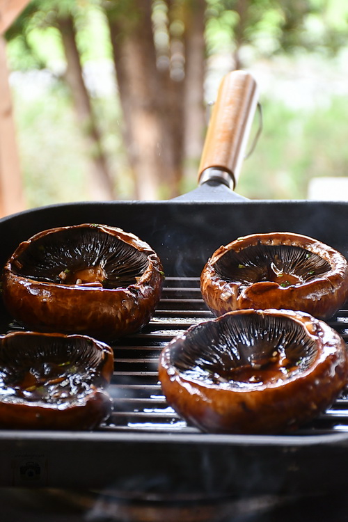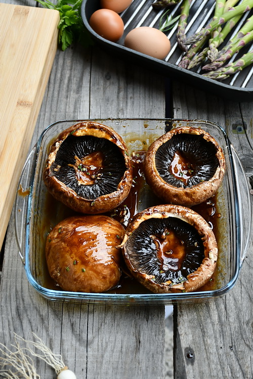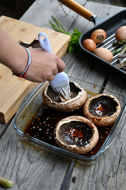 Se pregătește marinada amestecând într-un vas adânc sau într-o pungă cu zip toate ingredientele. Oțetul, uleiul de măsline, sosul de soia, rozmarinul tocat mărunt, usturoiul mărunțit, sarea și piperul. Se adăugă ciupercile în marinadă și se ung pe toate părțile cu ajutorul unei pensule. Se lasă în marinadă până se încinge o tigaie grill.