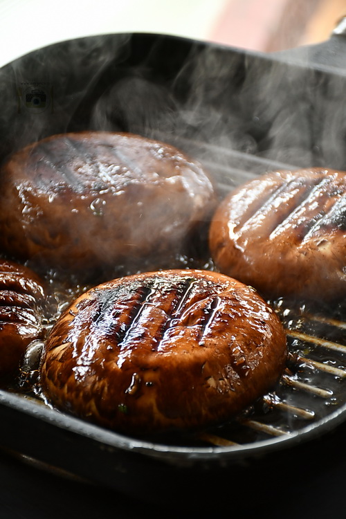 Când tigaie este încinsă, se adaugă puțin ulei și ciupercile. Se prăjesc câte 4-5 minute pe fiecare parte sau până își schimbă culoarea și marinada începe să se caramelizeze.