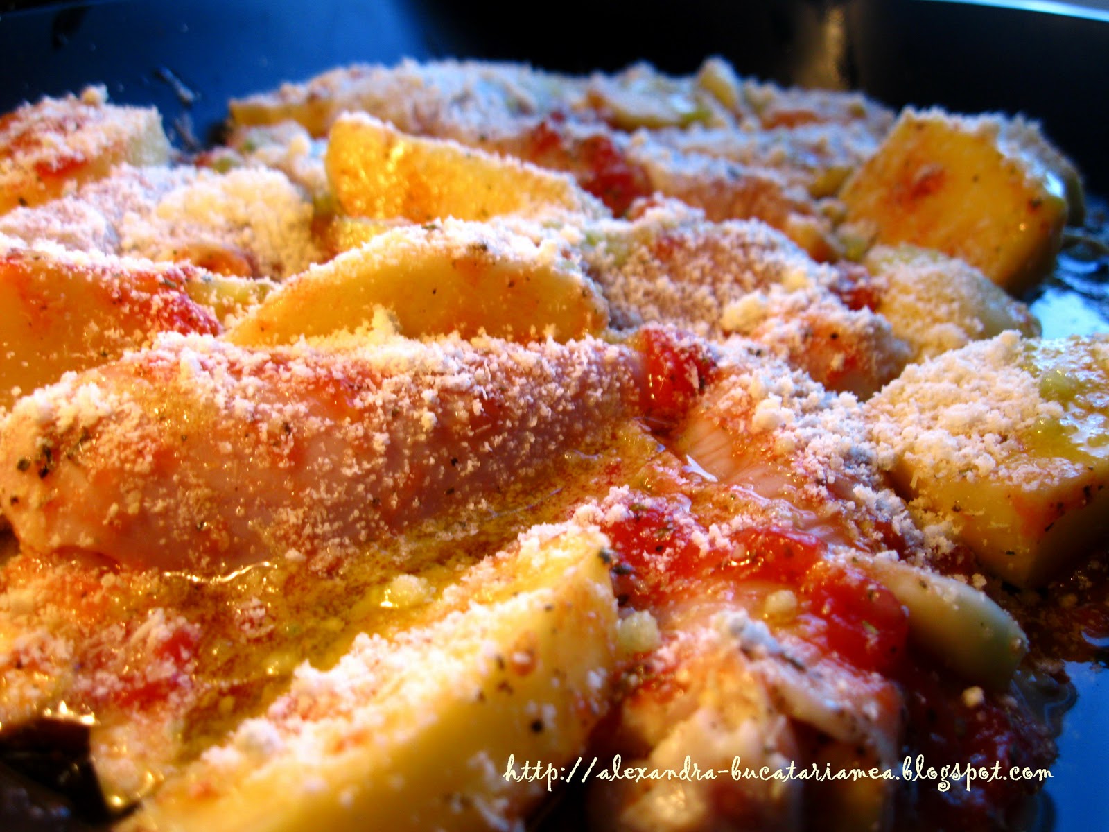 Şi dacă tot am făcut zilele trecute pizza, mi-a mai rămas prin frigider puţin sos de roşii cu pulpă. Aşa că am adăugat peste puiul meu subnutrit pulpa de roşii, nişte busuioc uscat, câţiva căţei de usturoi curăţaţi şi am condimentat cu sare şi piper. Final touch – am presărat parmezan ras şi am mai turnat deasupra încă vreo 3-4 linguri de ulei de măsline.