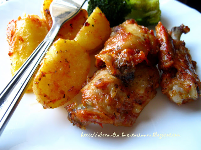 Am aşezat pulpele şi printre ele câţiva cartofi mici, curăţaţi de coajă şi tăiaţi în 2.