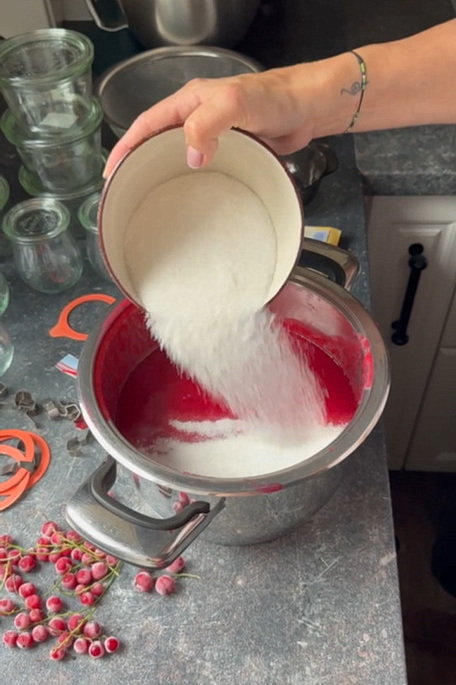 Când compoziția începe să fiarbă, adaugă restul de zahăr (aproximativ 230 g). Amestecă constant și mai fierbe 1-2 minute.