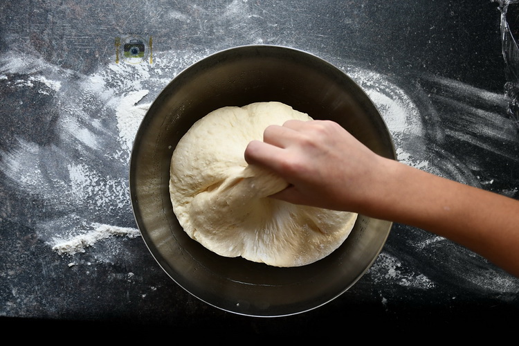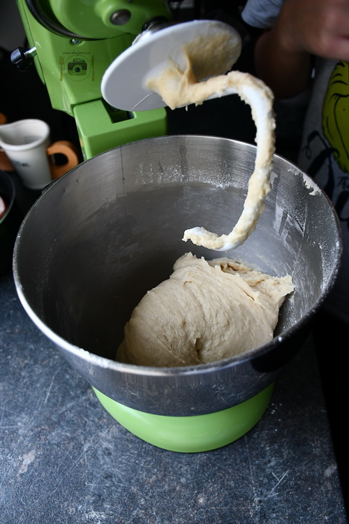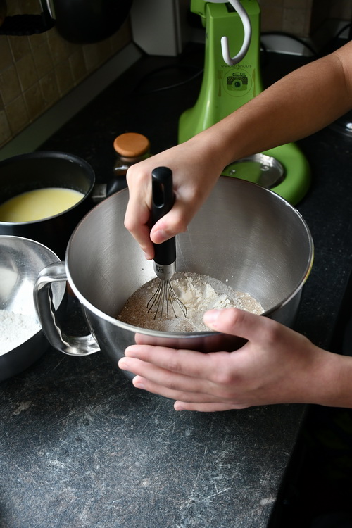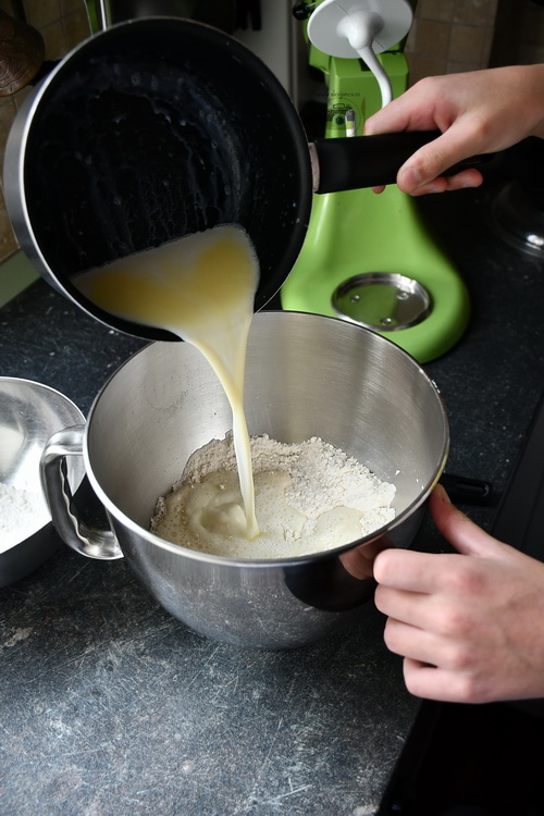 În bolul mixerului adaugă jumătate din cantitatea de făină, zahărul, drojdia și sarea. Adaugă apoi laptele cu untul, apa și oul.