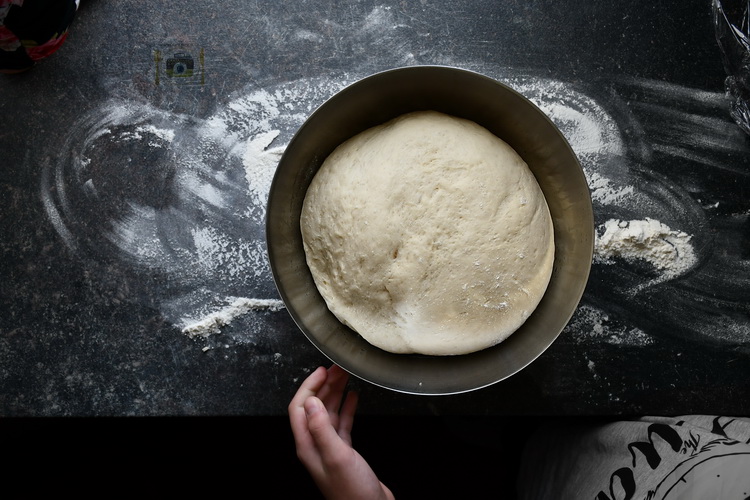 Transferă într-un bol uns cu puțin ulei și acoperă cu folie alimentară sau un prosop de bucătărie. E important să lași să crească aluatul într-un loc călduros fără schimbări bruște de temperatură, cum ar fi interiorul cuptorului nepornit. Aluatul se va dubla ca volum în 40-60 minute.