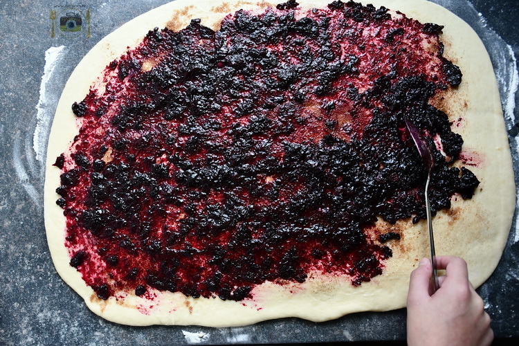 Când aluatul a crescut adaugă niște făină pe masa de lucru și pune copiii să frământe încă vreo câteva minute. Întinde apoi o foaie dreptunghiulară. Unge cu o pensulă sau un cuțit untul (poate fi topit sau la temperatura camerei) dar lasă marginea liberă. Amestecă zahărul brun cu scorțișoara și presară deasupra untului ( dacă îți plac aceste rulouri mai aromate poți dubla cantitățile de unt, zahăr și scorțișoară). Apoi întinde și sosul de afine deasupra.