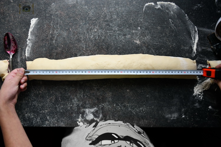 Și aici vine parte cu matematica. Faci ruloul de aluat, măsori cu liniarul/ruleta dimensiunea lui și în funcție de tava împarți la numărul de rulouri care vor intra în tava. În tava mea intră 7 rulouri mari. Am o tavă rotundă de 26 cm.