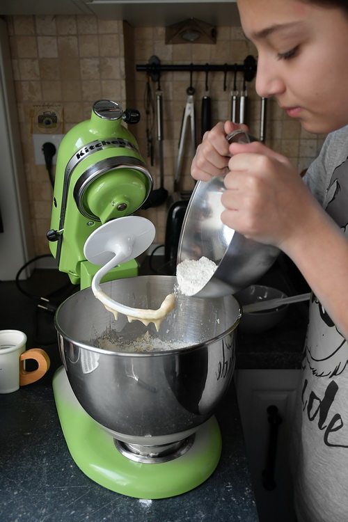 Pornește mixerul și amestecă bine. Adaugă apoi restul de făină și amestecă până obții un aluat dens.