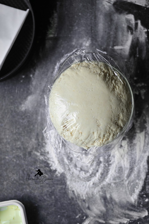 Se unge cu ulei un castron mare și se pune bila de aluat la crescut. Se acoperă cu folie de plastic sau cu un prosop curat și se lasă să crească până își dublează volumul (aproximativ 1 oră).
