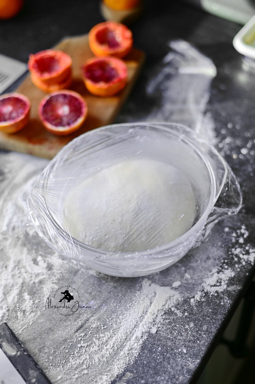 Se foloseste mixerul dotat cu cârligul pentru frământare. Peste drojdie se amestecă coaja de portocală, 3 linguri de zahăr și sarea. Se adaugă făina în etape de 1/2 cană. Se amestecă până când toate ingredientele sunt combinate.