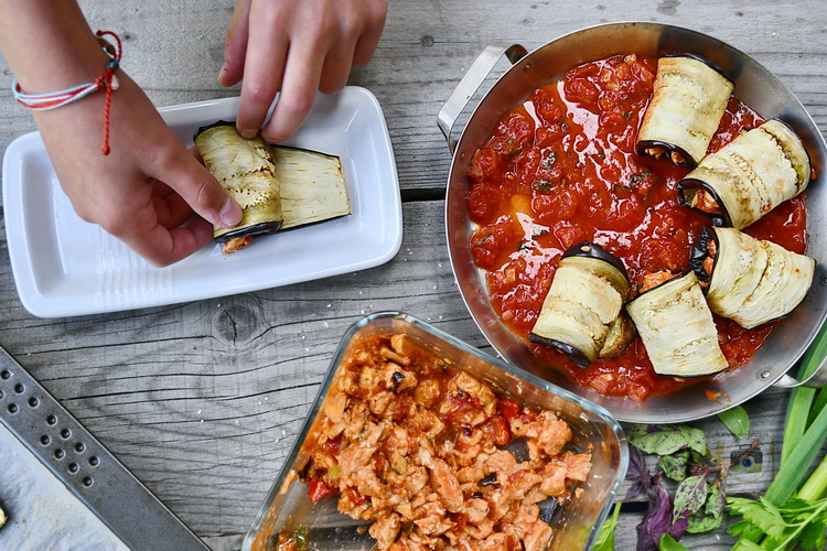 Rulouri de vinete cu leftovers de pui, în sos marinara