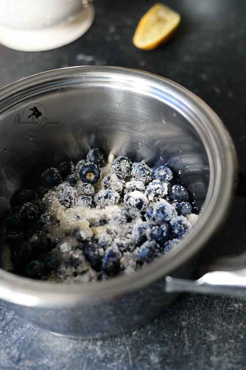 În timp ce aluatul crește, pregătiți umplutura. Pe aragaz, la foc mediu, combinați afinele, zahărul și zeama de lămâie, amestecând constant până când afinele se înmoaie, aproximativ 2-3 minute.