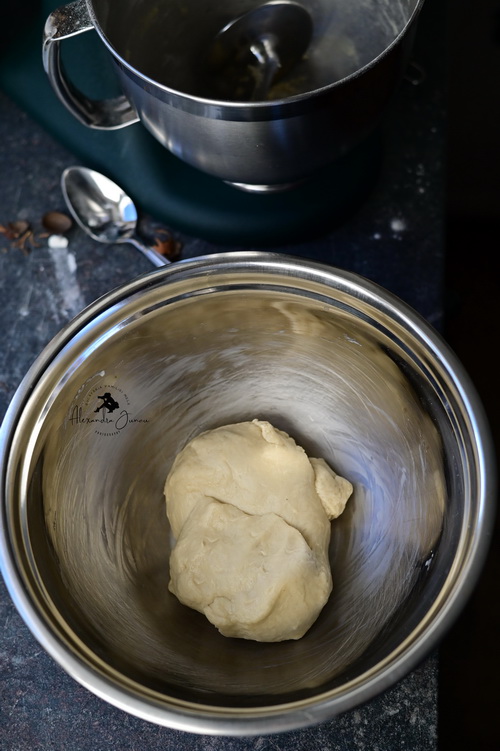 Amestecați la viteză mică spre medie până se formează o bilă de aluat, curățând făina de pe pereții bolului dacă este necesar. După ce aluatul se formează, creșteți viteza mixerului și frământați timp de încă 8-10 minute. Dacă aluatul se lipește de fundul/pereții bolului completați făină lingură cu lingură. Este posibil să aveți nevoie de încă 4-5 linguri de făină. Aluatul ar trebui să se adune și să fie lucios și neted, ușor lipicios și elastic.