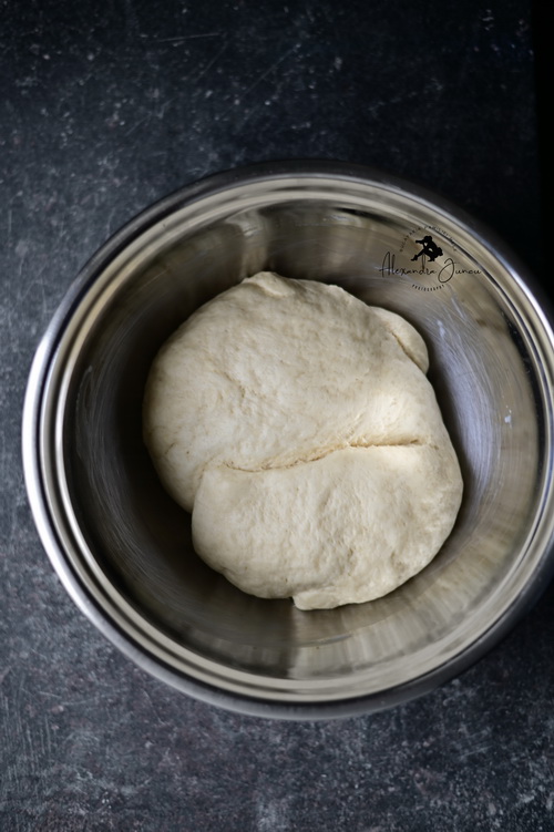 Notă – Dacă frământați aluatul cu mâna, amestecați ingredientele umede cu cele uscate până se formează un aluat. Presărați puțină făină pe suprafața de lucru (și pe mâini) și începeți să frământați aluatul. Dacă aluatul este foarte lipicios, adăugați făină lingură cu lingură. Este posibil să aveți nevoie de încă 4-5 linguri de făină pentru a nu fi foarte lipicios. Frământați aluatul cu mâna timp de 8-10 minute. Aluatul ar trebui să se adune și să fie lucios și neted, ușor lipicios și elastic.