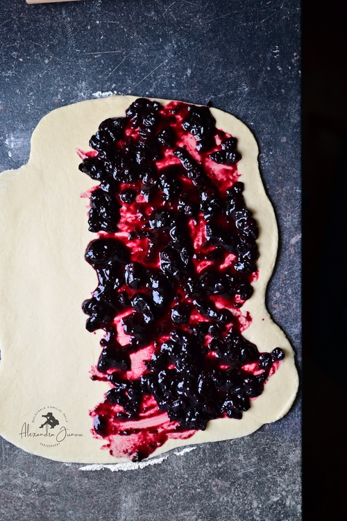 Scoateți aluatul din bol, puneți-l pe o suprafață ușor presărată cu făină și cu ajutorul unui sucitor, întindeți aluatul într-un dreptunghi.