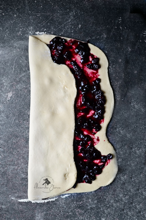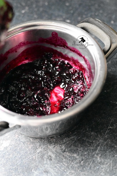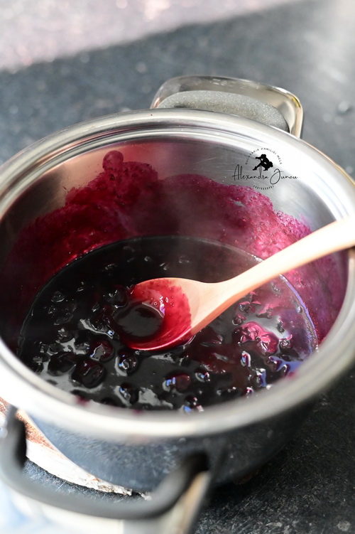 - Step 4 Umplutura cu afine – În timp ce aluatul crește, pregătiți umplutura. Pe aragaz, la foc mediu, combinați afinele, zahărul și zeama de lămâie, amestecând constant până când afinele se înmoaie, aproximativ 2-3 minute. Cu o unealtă de făcut piure sau cu dosul unei linguri, zdrobiți afinele. Lăsați amestecul să fiarbă, amestecând din când în când, până când se îngroașă, aproximativ 5-10 minute. Îndepărtați de pe foc și lăsați să se răcească în timp ce aluatul își completează prima creștere.