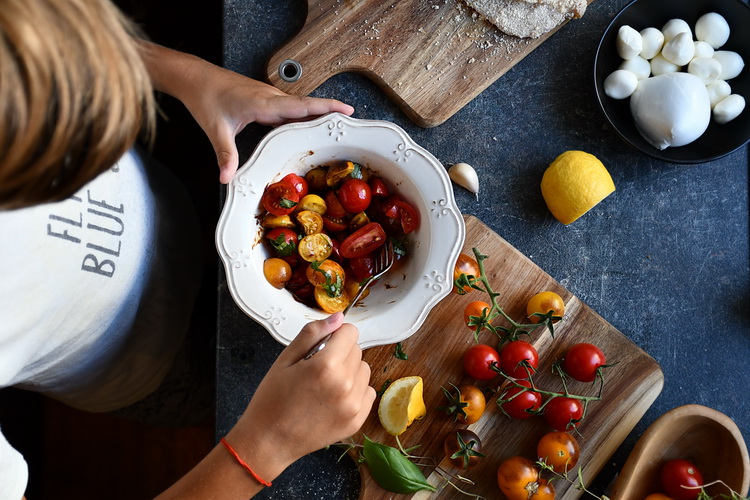 Cât timp copilul care a pregătit șnițelul se spală pe mâini intră în scenă cel de-al doilea ucenic din bucătăria mea. Mezinul e responsabil cu salata de roșii.