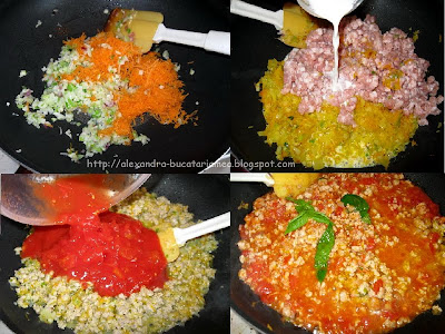 Se încinge uleiul de măsline într-o tigaie şi se adaugă ceapă tocată mărunt şi usturoi mărunţit bine. Se găteşte până când ceapa devine translucidăSe adaugă morcovul dat prin răzătoare şi eventual țelina ( dacă folosiţi) şi se mai lasă încă 2 minute. Se adaugă oregano.
