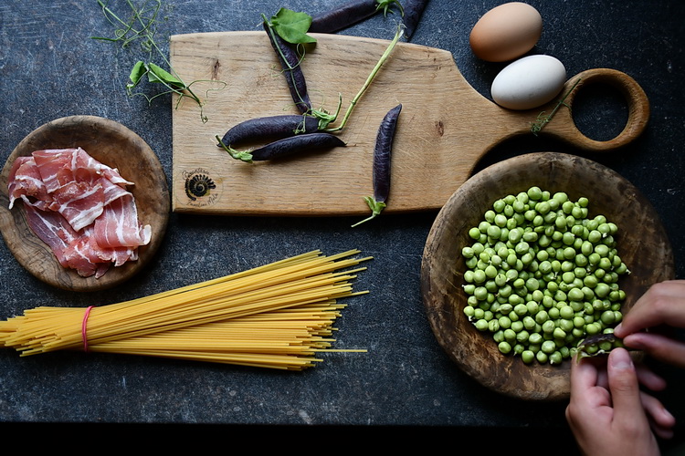 Pune pe foc o oală mare cu apă. Când fierbe adaugi sare și gătești spaghetele conform instrucțiunilor de pe ambalaj. Calculezi cu 1 minut mai puțin decât scrie pe ambalaj și adaugi mazărea proaspătă. Lași mazărea să fiarbă împreună cu pastele încă 1-2 minute.