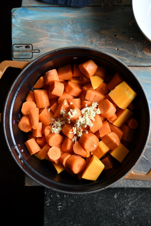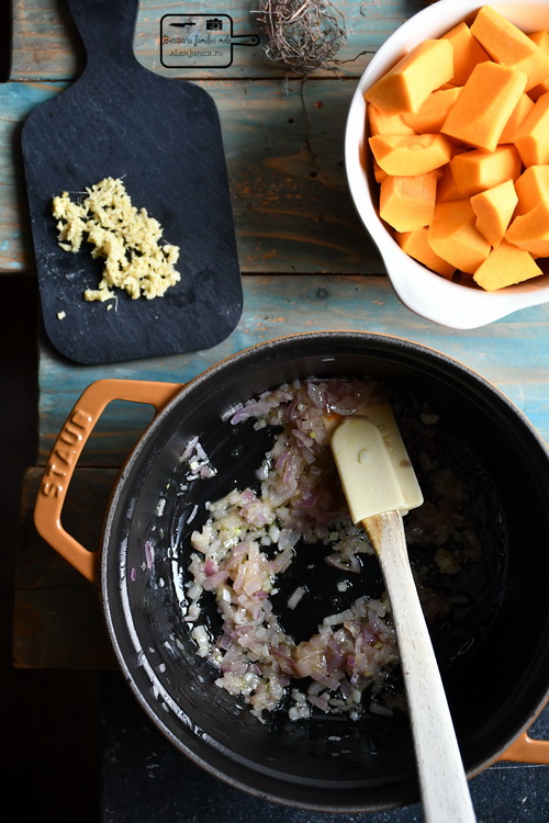 Adăugați peste ceapă dovleacul și morcovi, usturoiul și ghimbirul. Căliți încă vreo 2-3 minute amestecând des.