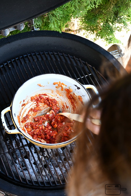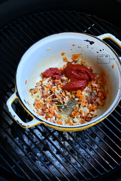 Într-o oala mare gătesc baconul până devine crocant. Adaug untul, ceapa și morcovul. Gătesc până se înmoaie și adaug usturoiul trecut prin presă. Adaug pasta de tomate și amestec până legumele din oala se închid la culoare.