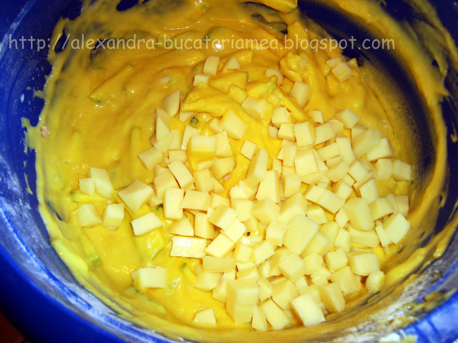 În amestecul de ouă adaugăm zucchini-ul, mezelul și mozzarella. Amestecăm din nou pentru a încorpora cât mai bine ingredientele în aluat.