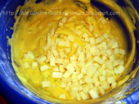 și un vârf de cuțit de sare (sau după gust) . Turnăm amestecul de ouă peste faină și amestecam , cu o spatulă sau lingură de lemn.