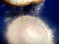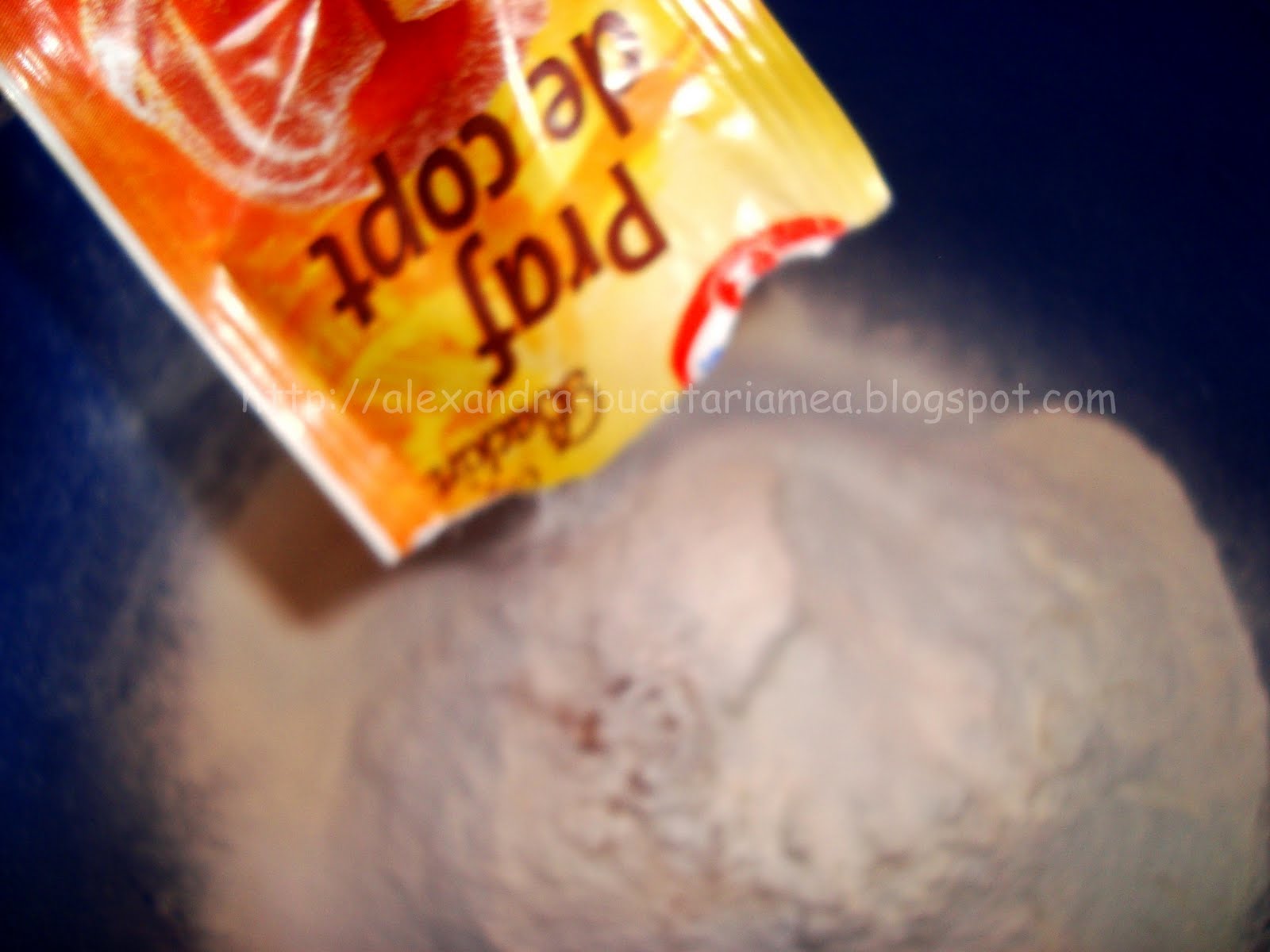 Într-un bol cernem faina şi o amestecăm cu praful de copt,