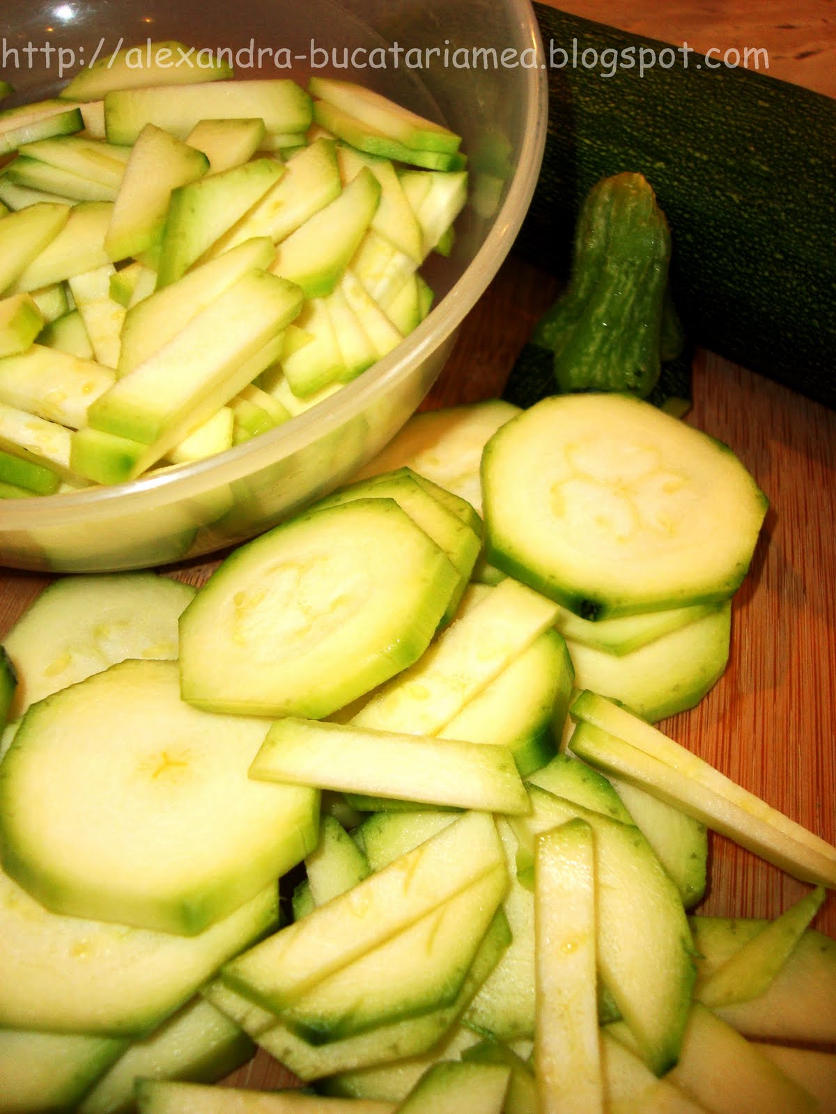 Spălăm zucchini-ul şi îl curățăm de coajă cu aparatul de curățat cartofi (dacă doriţi puteţi să îl folosiți cu tot cu coajă, nu deranjează la gust).Tăiem zucchini-ul în bastonaşe sau felii, în funcție de gustul fiecăruia.Eu am încercat ambele modalități de tăiere și prefer bastonaşe.