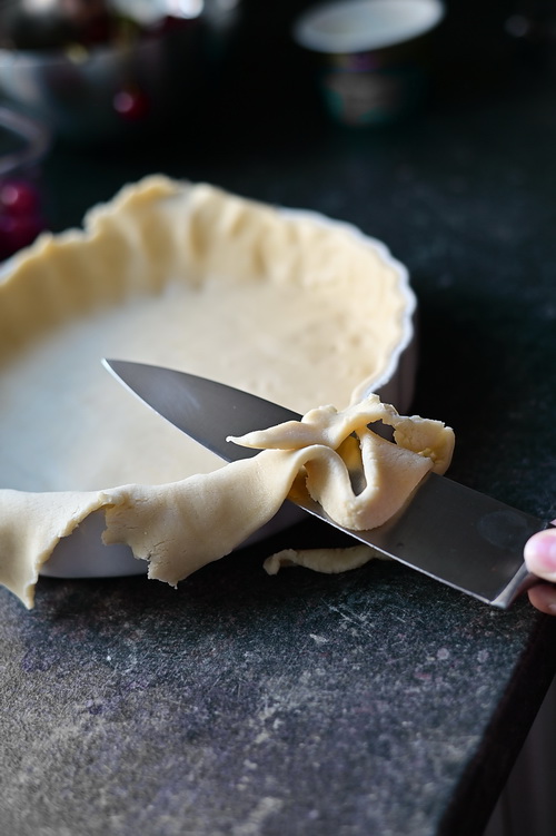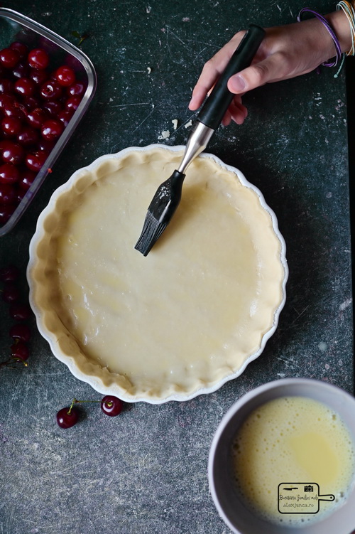 - Step 6 Tarta. Scoate tava cu aluatul din frigider. Bate oul cu o furculiță și adaugă o lingură de apă. Unge aluatul cu ou bătut, folosind o pensulă de patiserie. Adaugă vișinele în tavă și nivelează-le.