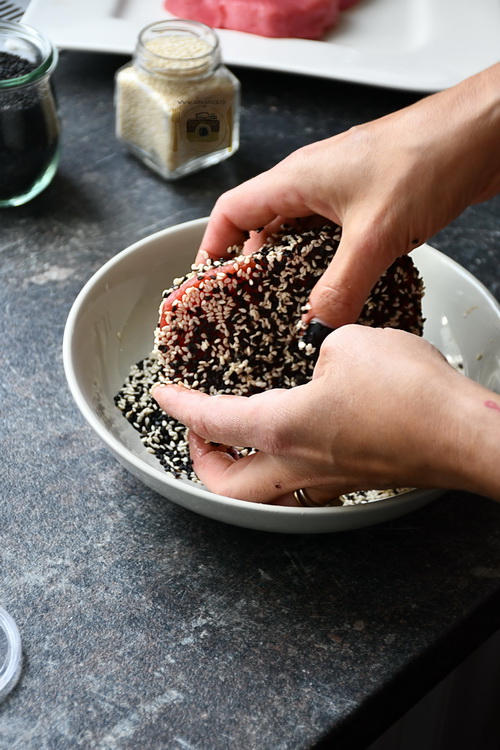 - Step 5 Combini semințele de susan alb-negru într-o farfurie întinsă, apoi apeși ușor tonul în semințe pentru al acoperi pe toate părțile.
