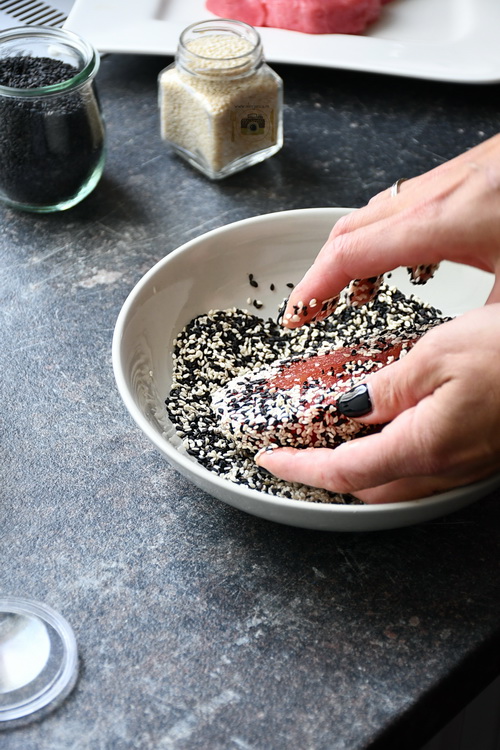 Combini semințele de susan alb-negru într-o farfurie întinsă, apoi apeși ușor tonul în semințe pentru al acoperi pe toate părțile.