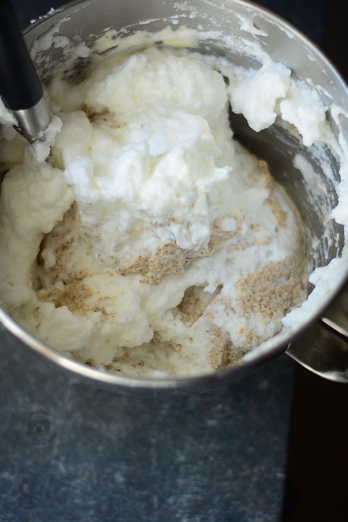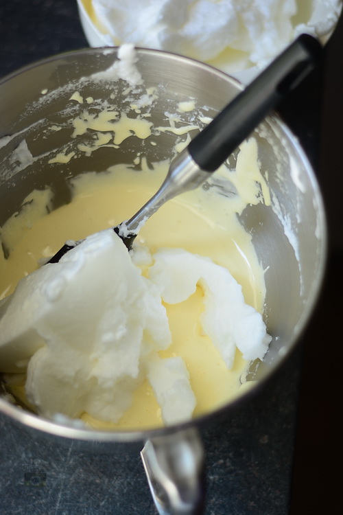 - Amestecați jumătate din spuma de albușuri peste crema de gălbenușuri, ușor cu o spatulă, prin mișcări de jos în sus. Adăugați apoi ingredientele uscate și amestecați la fel de încet doar până se încorporează în spumă. In final adăugați restul de spumă de albuș și amestecați tot cu spatula cu mișcări largi de jos în sus. Ideal ar fi să nu exagerați cu amestecatul, ci doar până se încorporează spuma în restul aluatului.
