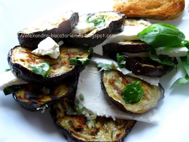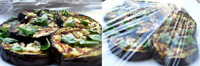 Feliile de vinete le întoarceți şi le așezați pe farfurie alternându-le cu feta. Ornați cu busuioc şi serviți.